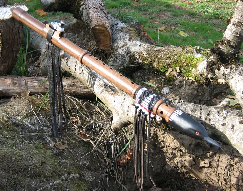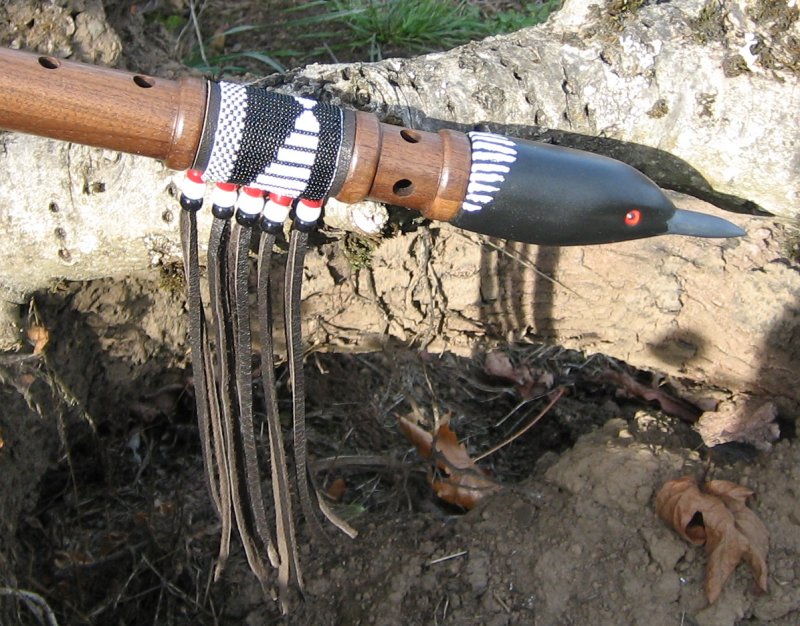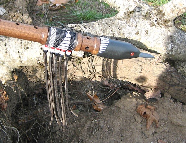 Created in Spanish Cedar (Hardwood - of the Mahogany family) the spirit end (Bass Wood) is meticulously hand crafted and hand painted. The vibrant sound that emanates from this flute is exceptional as each note played can be felt by the players finger tips! This flute is perfectly 'balanced' so as not to be compromised by the closed end or beak. With the 'Breath of Life' minimum breath air flow design (pioneered by Waking Spirit Flutes) this flute is ideal for both the beginner and the more experienced professional player/recording artist. The 'Breath of Life' minimum breath design enables inventive playing and longer phrasing between breath intakes. Real loom woven glass beads, hand sewn onto quality hide add a decorative contrast to this outstanding instrument. This instrument, along with others in this special range, are considered to be the finest Spirit Ended flutes available. If you have any questions, please contact me at: Waking Spirit Flutes |